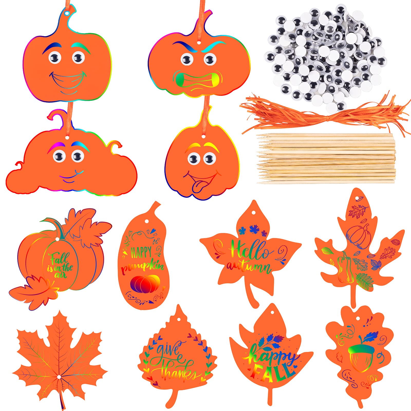 Whaline 60 Set Fall Scratch Art Set Colorful Autumn Leaves Pumpkin Shape Scratch Paper Pairs Wiggle Eyes Orange Ribbon wit...